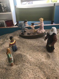 I decided to assemble a sandtray that included the teenage me, the adult me, my father’s spirit and Baby’s First Steps which is strictly in the background. The adult me is the long haired blond person, the teenager is the boy standing next to him and his father’s spirit is man with the long white beard. Please see photo.